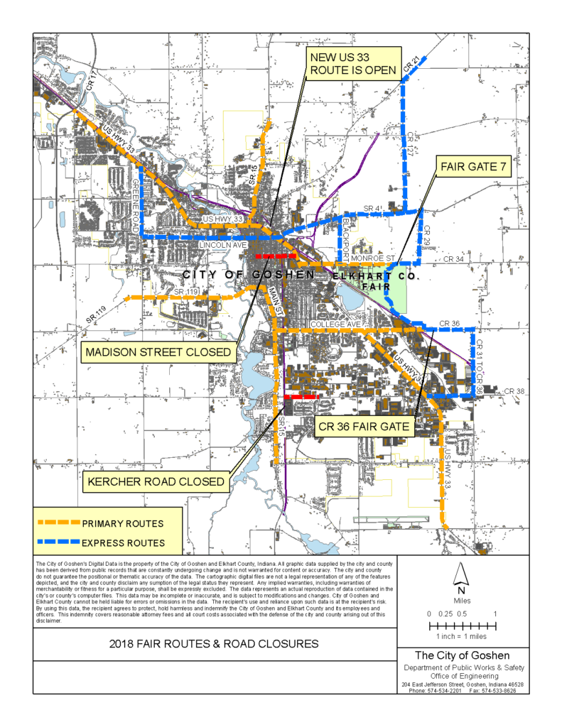 This updated map shows the various roads through which visitors can access the Elkhart County 4-H Fair this year. Note that the new US 33 bridge is now open to traffic. Madison Street will remain closed during fair week to all traffic with the exception of the parade.