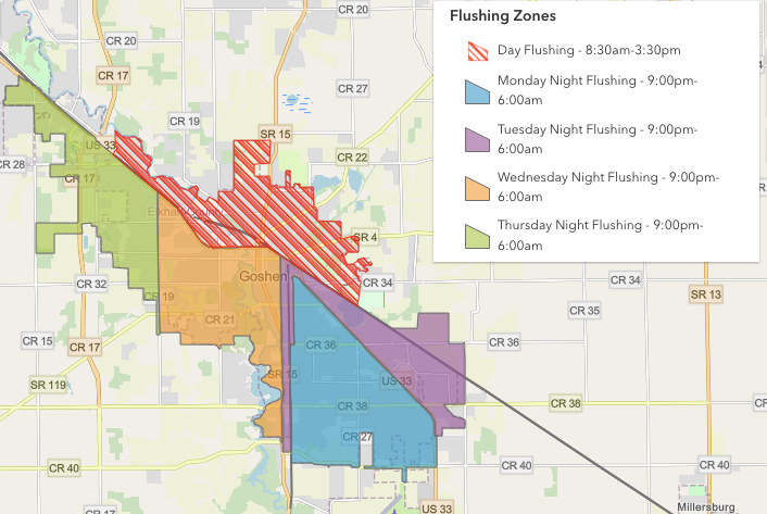 From Monday, October 9 through Friday, October 13, the Goshen Water & Sewer Department will be flushing from 8:30 a.m. to 3:30 p.m. in the upper-pressure zone, which is everything northeast of U.S. 33 and the Norfolk Southern tracks.