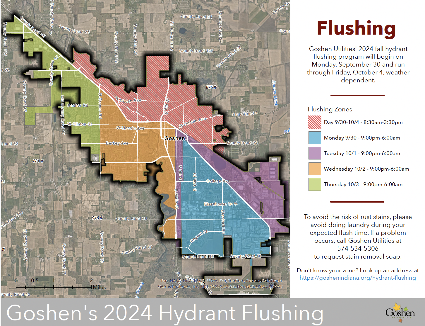 From Monday, September 30, through Friday, October 4, the Goshen Water & Sewer Department will be flushing hydrants from 8:30 a.m. to 3:30 p.m. in the upper-pressure zone, which is everything northeast of U.S. 33 and the Norfolk Southern tracks