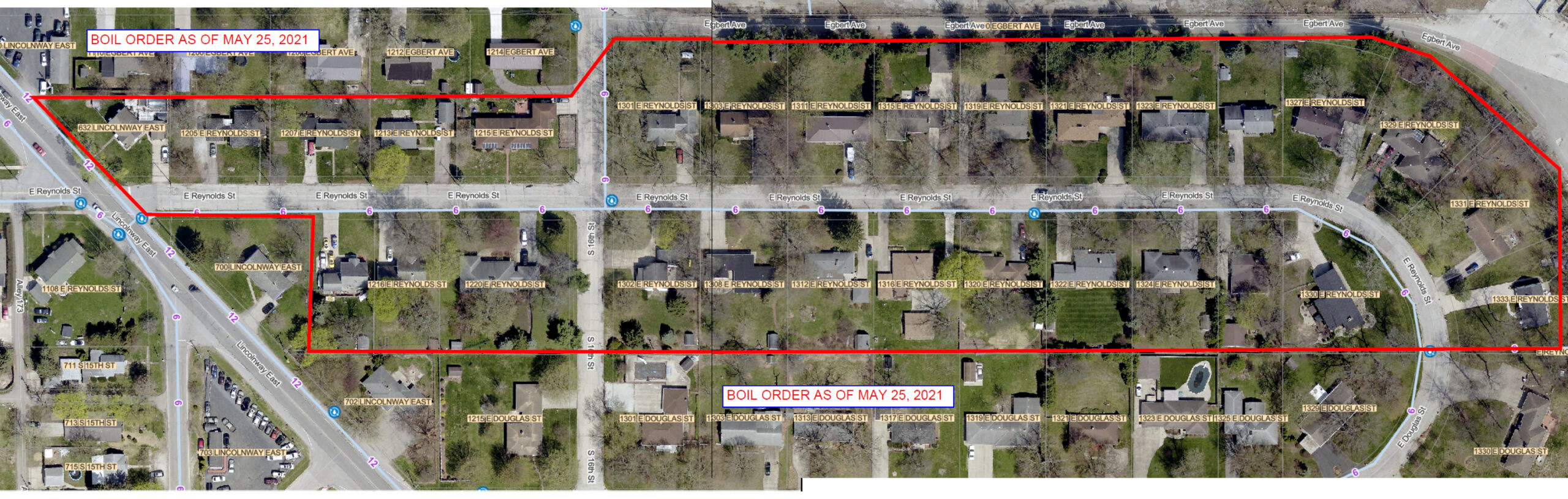 On Tuesday May 25, 2021, the water main was shut off to repair a main; a boil order was issued. The Indiana Department of Environmental Management requires the Water Utility to issue a boil water order for the affected area. Residents in the affected areas were notified.