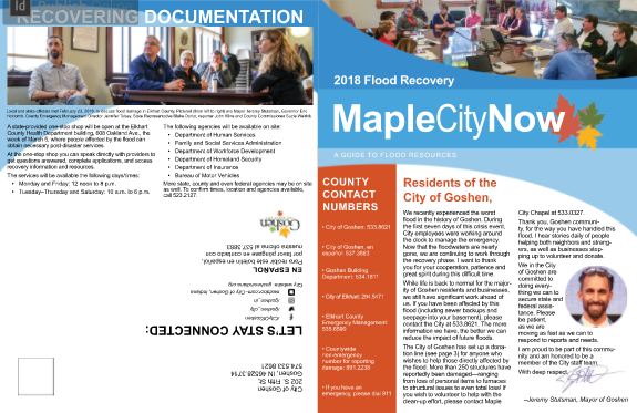 A special edition of the MapleCityNow has been released and will be in all of Goshen residents’ mailboxes Tuesday, March 6. The newsletter covers important information about damage assessments, cleaning and repairs, and volunteer efforts. A portion of the information in the newsletter has been shared on the City of Goshen website and on social media through the City of Goshen, Indiana Facebook Page.