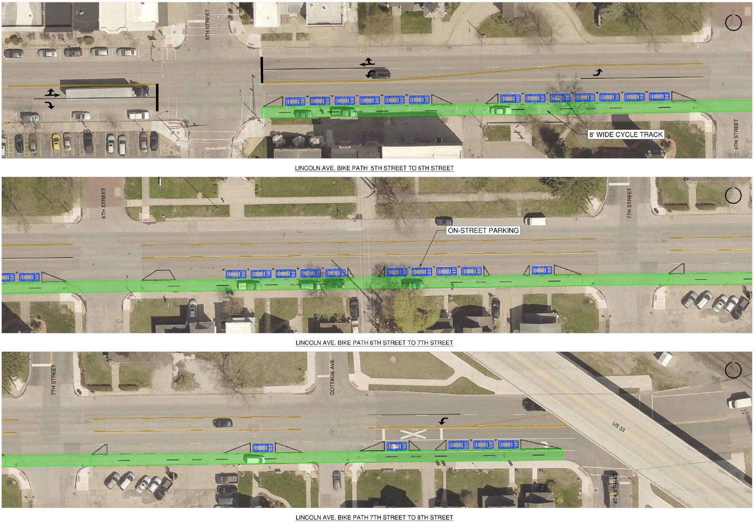 The City will install a demonstration Cycle Track lane along the south side of Lincoln Avenue between 5th and 8th streets in early May, with the plan for the lane to remain over a period of several months as a trial to determine if a permanent cycle track can be installed in the future.