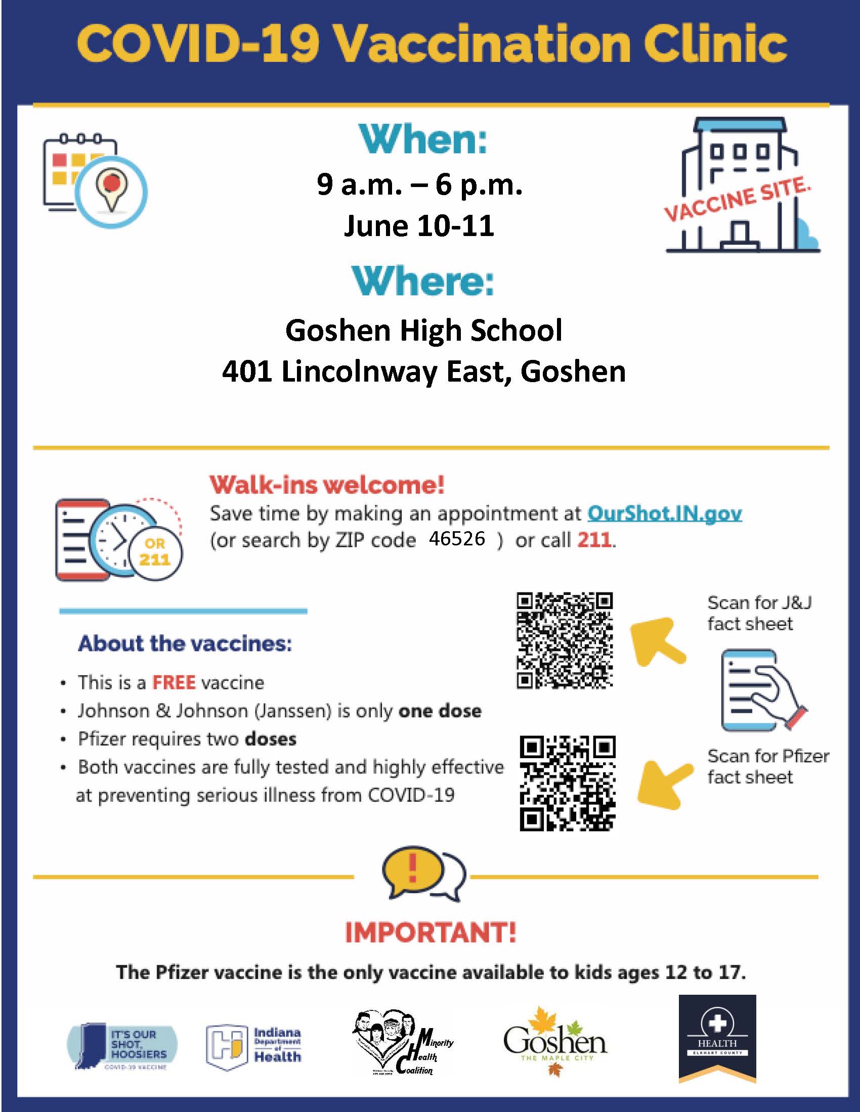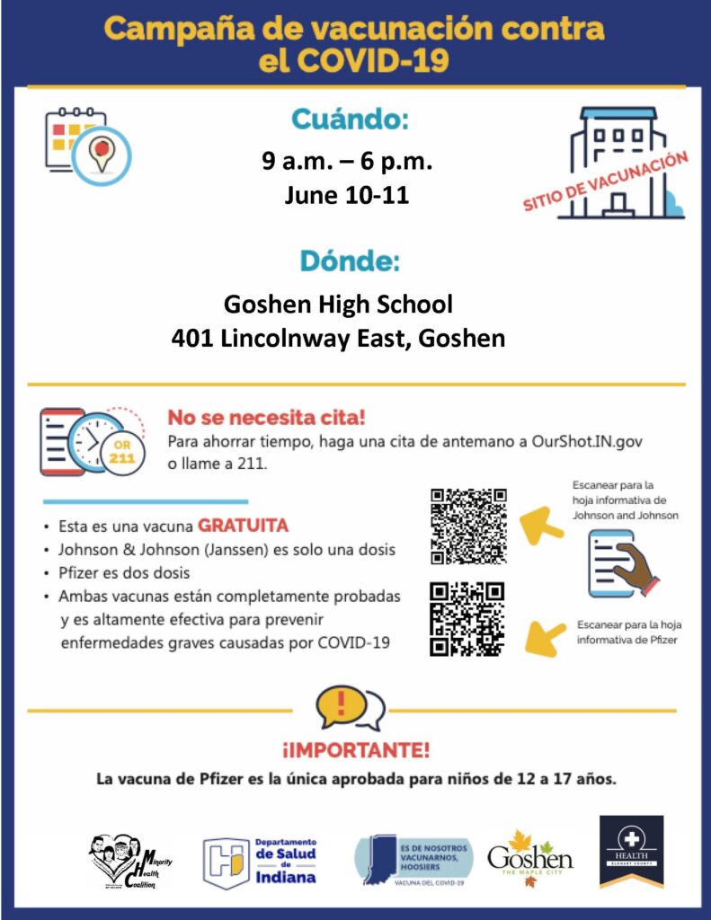 A COVID-19 Vaccination Clinic is scheduled for June 10th and 11th in Goshen. The clinic will be open 9am – 6pm at Goshen High School, 401 Lincolnway East.