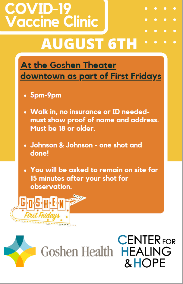 Goshen Health, in partnership with the Center for Healing and Hope, will hold a vaccine clinic at the Goshen Theater during First Fridays August 6, 2021, from 5 to 9 p.m.