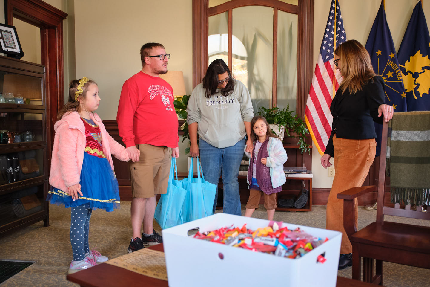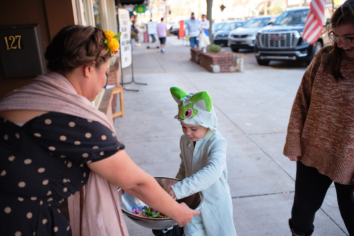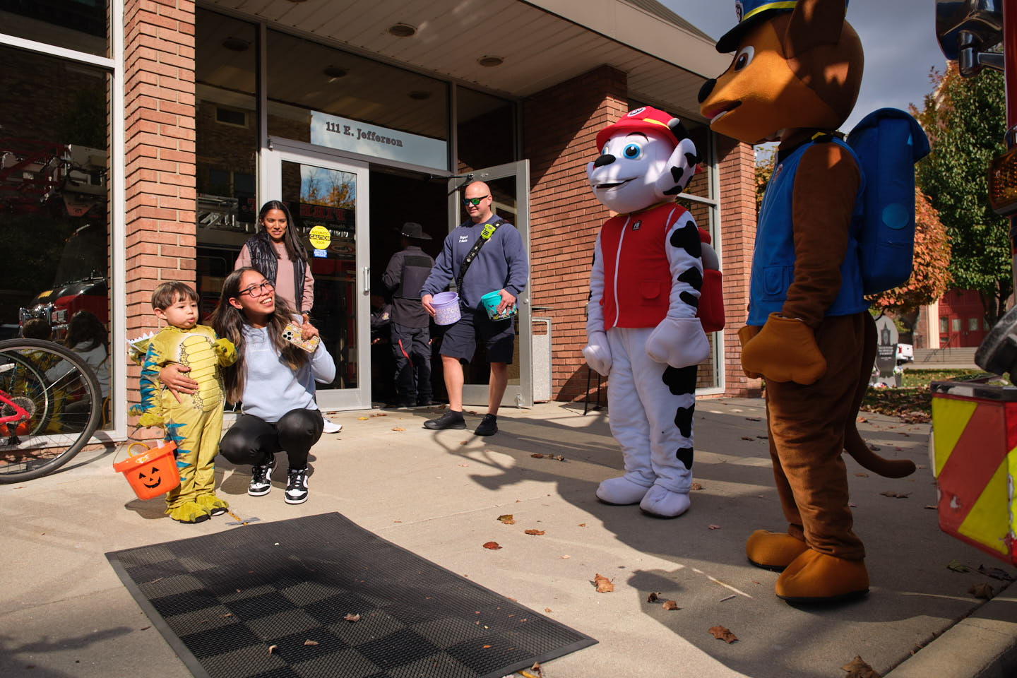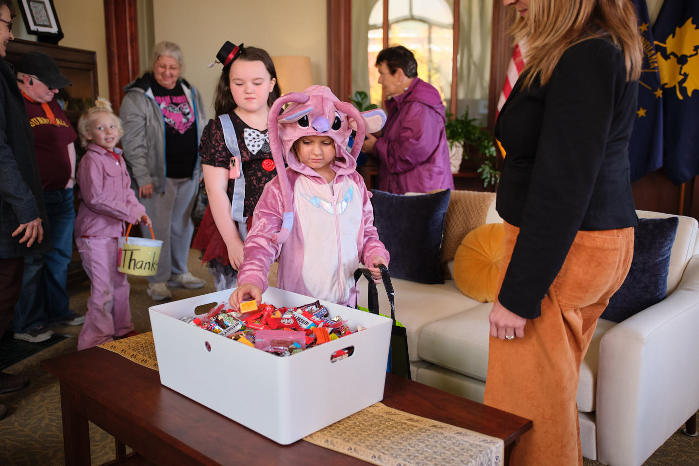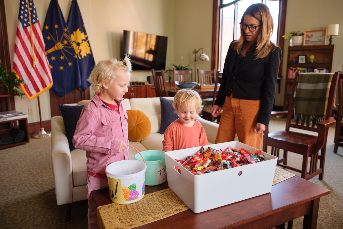 Mayor Gina Leichty greeted young trick-or-treaters at her office in the Old Carnegie Library, one more stop in a downtown tradition built on fun and community.