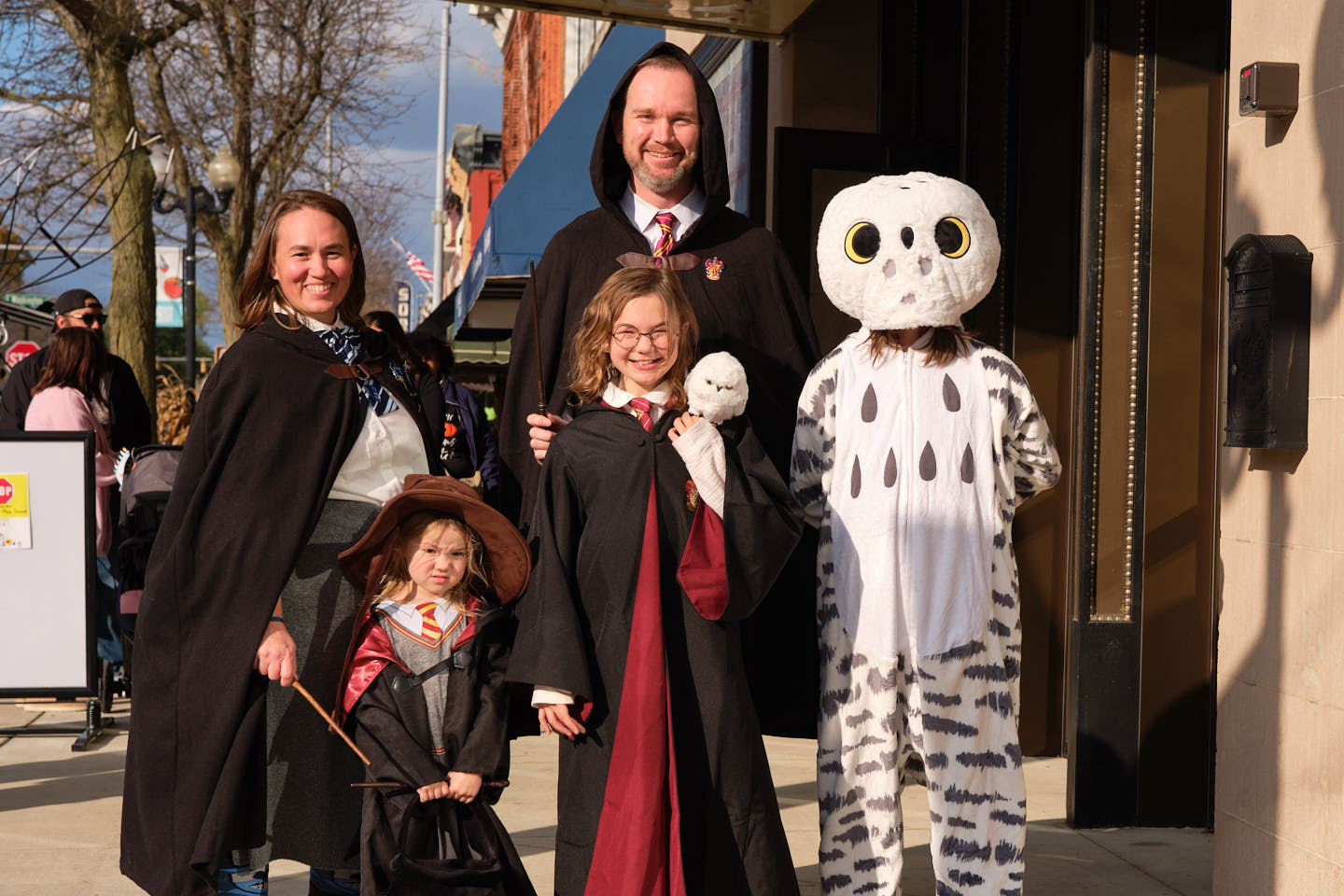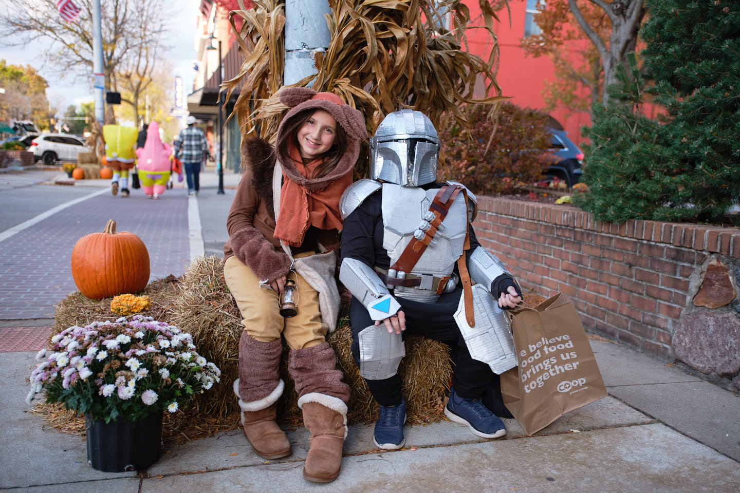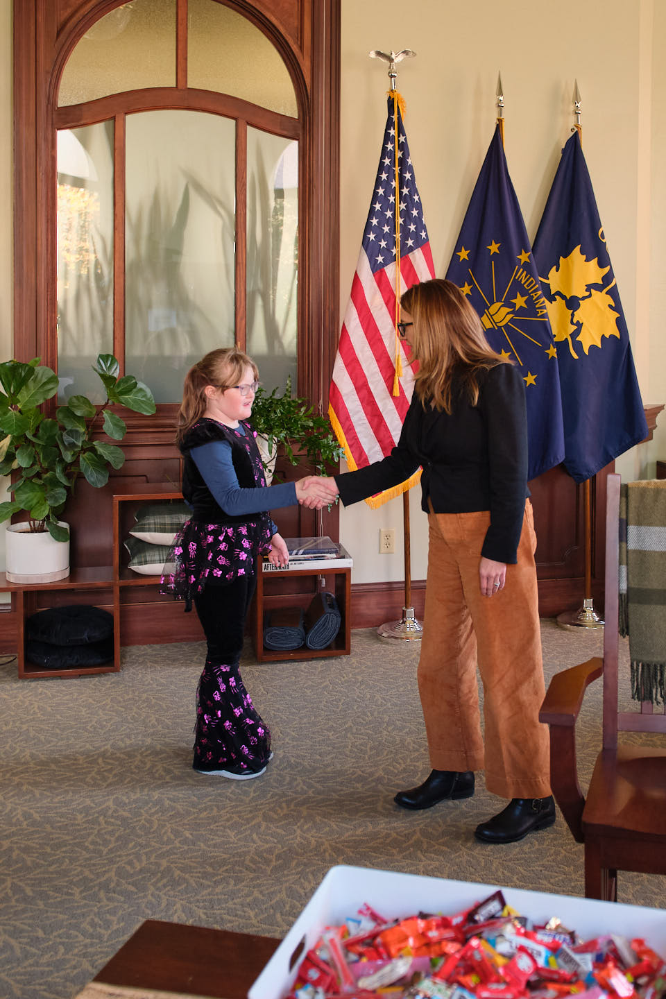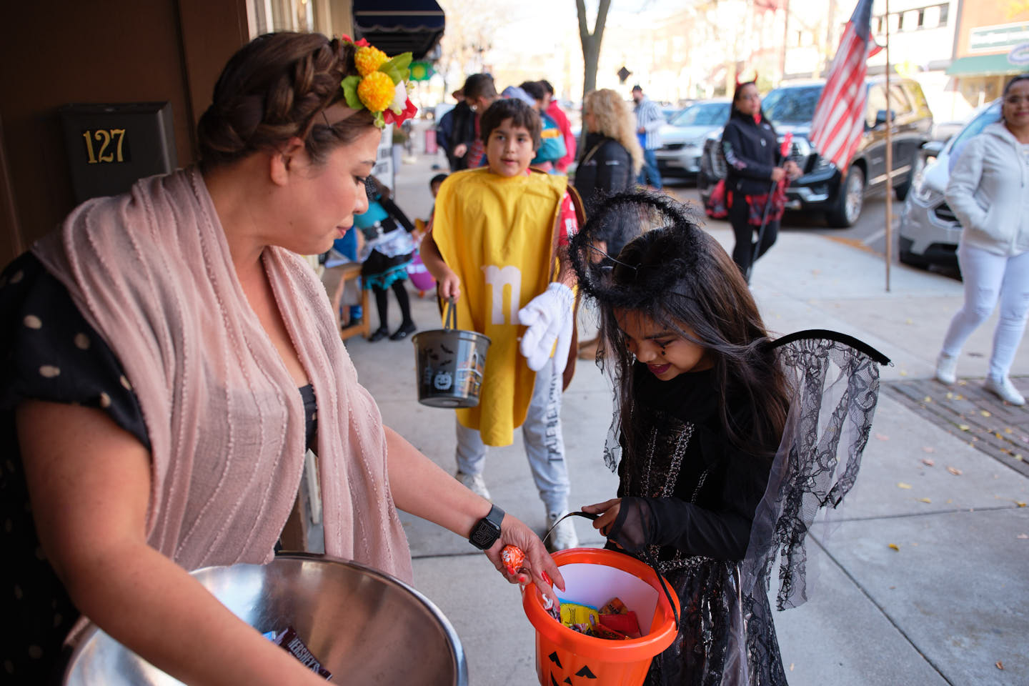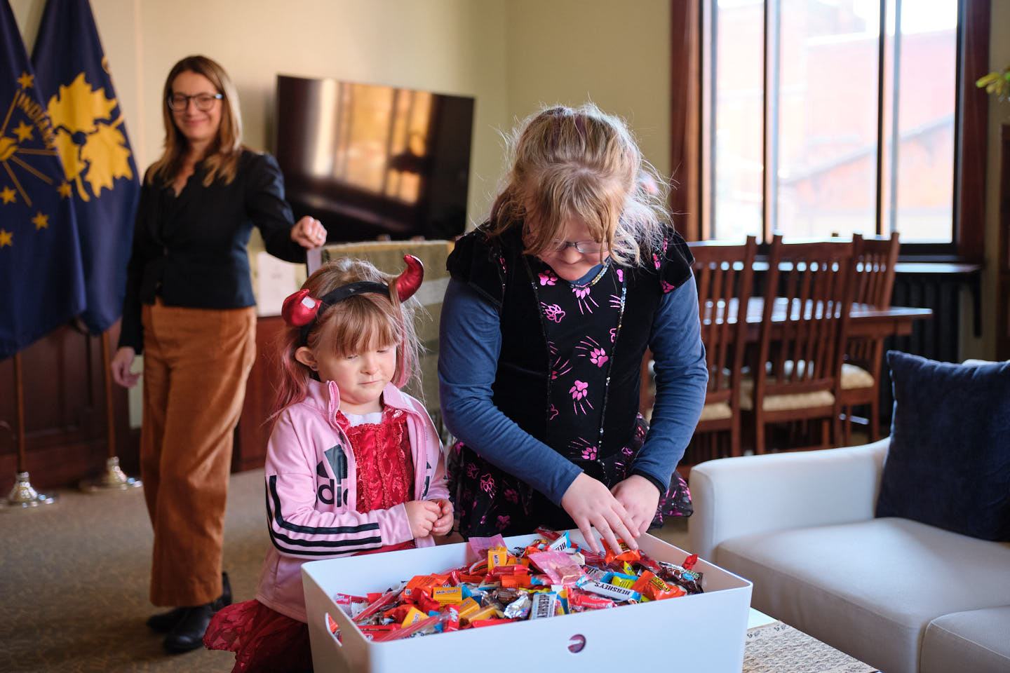 Mayor Gina Leichty greeted young trick-or-treaters at her office in the Old Carnegie Library, one more stop in a downtown tradition built on fun and community.