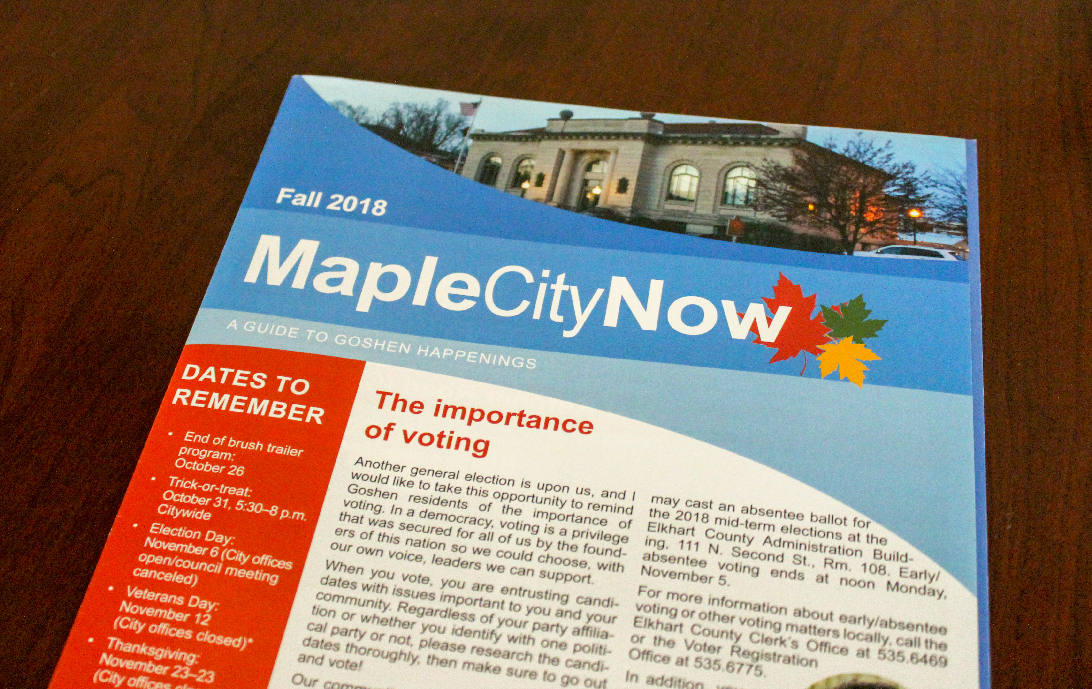 Goshen residents will find copies of the Fall MapleCityNow in their mailbox over the next few days. Residents can also find extra copies at the Goshen Chamber of Commerce, LaCasa, Inc. and City offices beginning the week of Oct. 29. This season’s newsletter features information about renovations to the Wastewater Treatment Plant,leaf collection information and updates to Kercher Road.