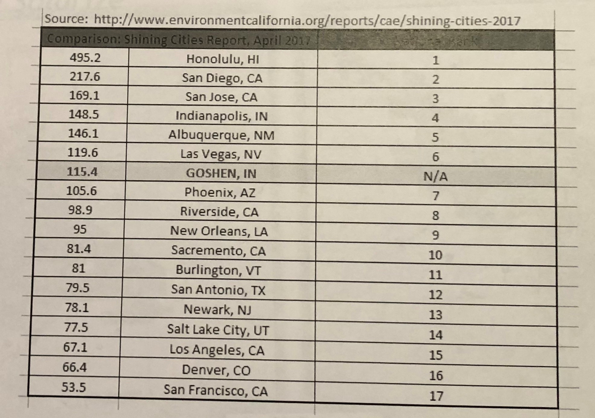 The City of Goshen now outranks many of the well known “Solar Cities.,” (i.e. Phoenix, San Francisco, L.A., Sacramento) This ranking is created by looking at solar output per person.