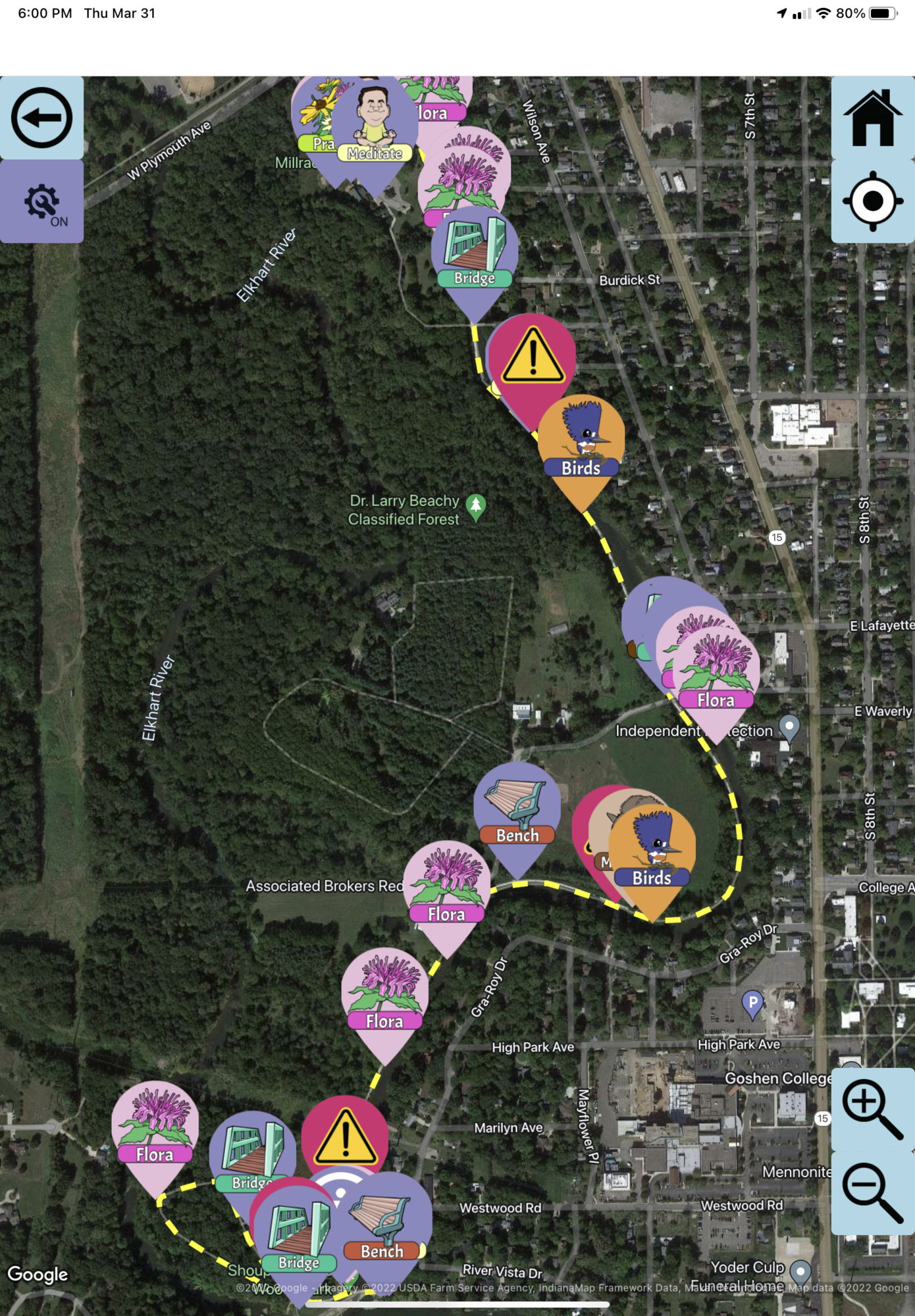 What is it all about? The City of Goshen, ADEC, Inc. and Goshen College partnered to connect persons with disabilities to the natural environment’s physiological and psychological benefits by utilizing technology. The project provides supportive tools where persons with disabilities can interact with nature in an immersive and physical way. This project was the first known of its kind to utilize technology to connect residents and visitors to a local community’s natural environment and its vibrant community of living things through the creation of a free downloadable app of natural living things on a trail system and the utilization of an online camera system connected to natural areas in the community. The downloadable app can be used while walking down the trail where it utilizes global positioning mapping to show the user’s location and the location of living features on the trail or from the comfort of a person’s home.