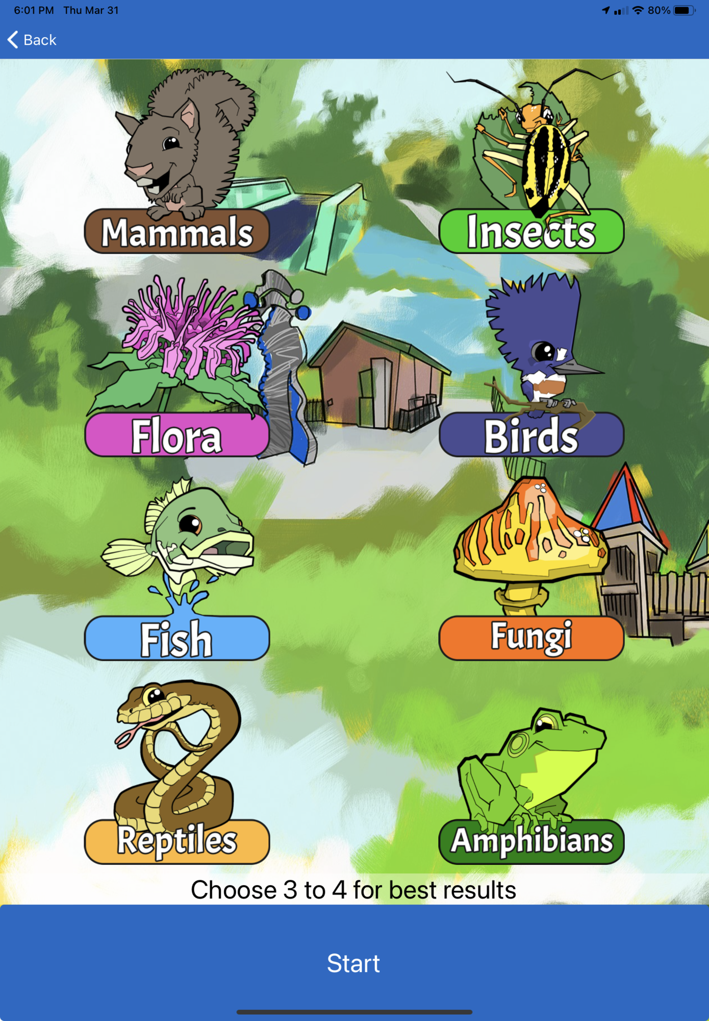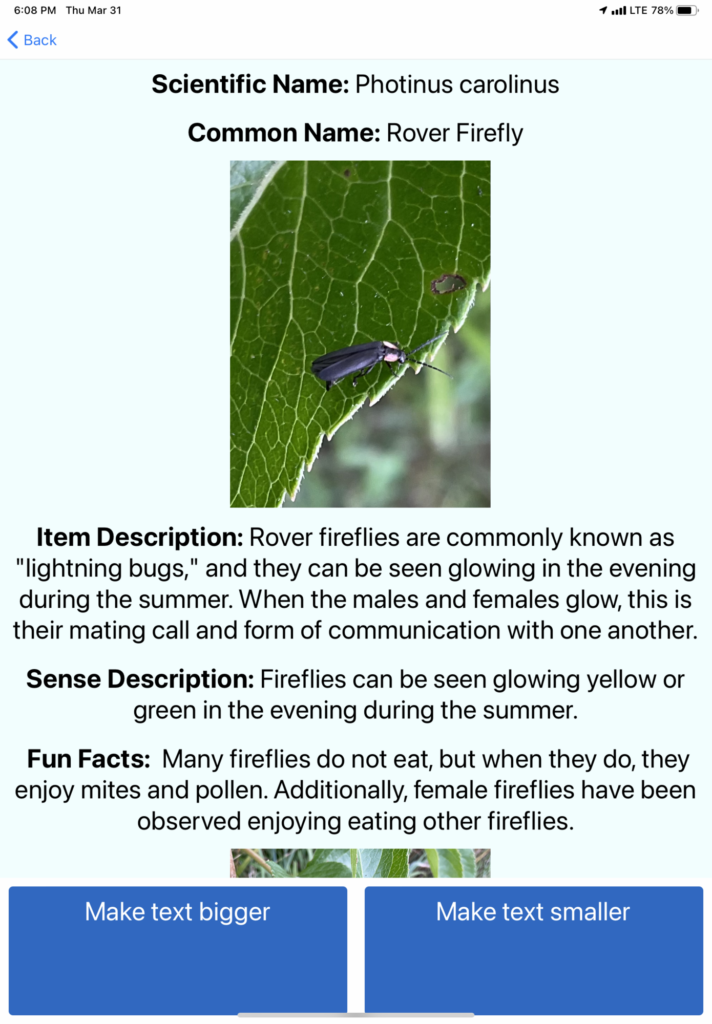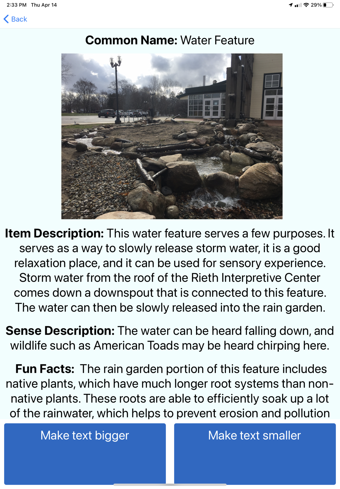 The app acts as the portal to the sensory trail. The 900+ currently identified features are not identified on the trail itself. The app leads the user to the feature using an integrated GPS map where the selected features and trail amenities are displayed. The user is led to within ten feet of the feature, or where a living thing was found (mammals, amphibians, or others), where the user must look for the feature given the clues in the app. The app provides pictures, a description, a video, and sometimes an audio recording (birds, amphibians).