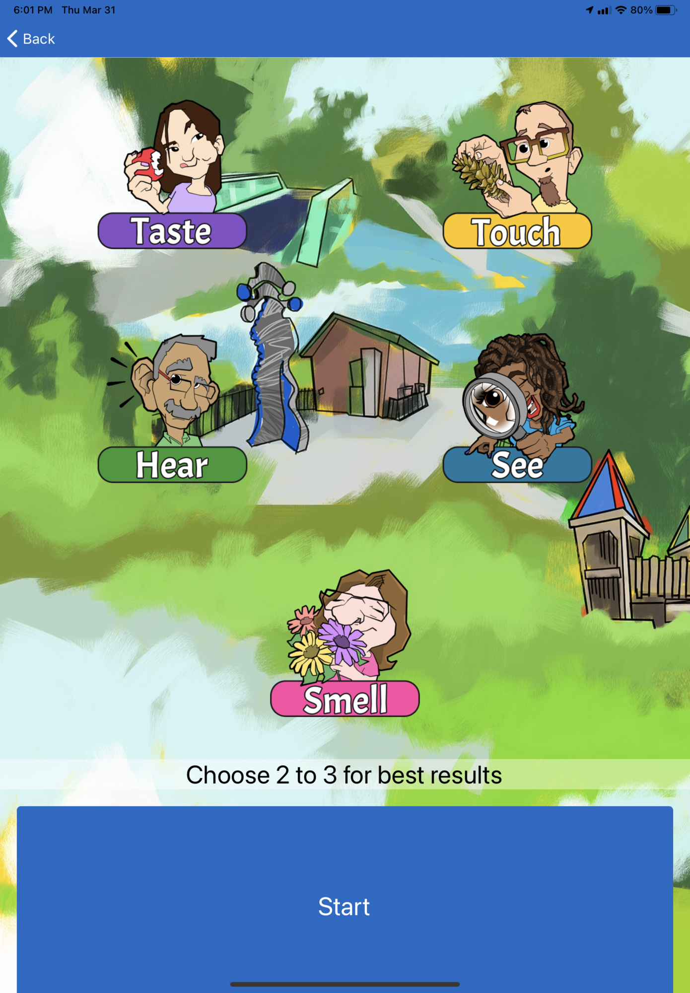 The app features professional artwork and uses positive or neutral sensory colors including green, teal blue, blue, purple, black, and white. Brighter colors such as yellow and orange are muted or used in limited ways. Bright pink with a yellow exclamation mark stands out and denotes hazards in each zone, where applicable. Red is not used on the app for any application.
