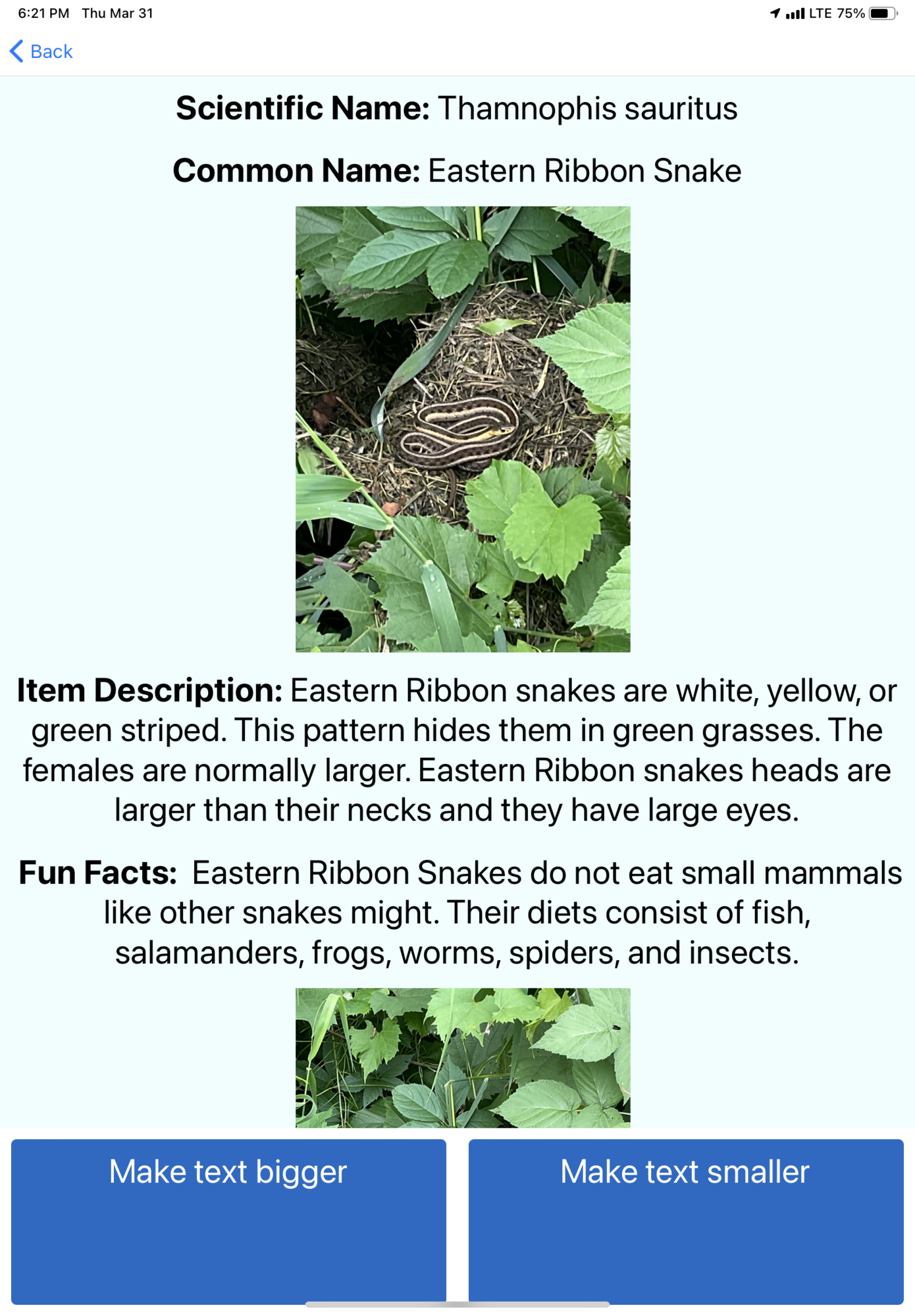 The app was designed to provide a “safe” platform for persons with disabilities and especially sensory sensitivities to enjoy being outside. It was designed utilizing a calm (neutral) color palette, providing warnings of potential hazards (zone alerts), including areas of road hazards, uneven surfaces, areas of extensive poison ivy, or the existence of poison hemlock for example. The zone alerts can be easily updated to accommodate changing conditions on the trail. Other accessibility features include the ability to enlarge font sizes, enlarge or pop-out photos, high contrast color scheme, and the ability to utilize the device’s Voiceover accessibility features to read content to those who are visually impaired or unable to read.