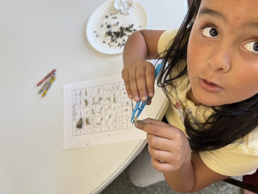 The group I helped with started with an owl pellet dissection. While many of the kids approached their pellets with a bit of hesitation, when they eventually dug in, they found all kinds of bones! Some of them were lucky enough to find entire, intact skulls buried in their pellets, but everyone was able to pick out some leg bones and learn a little bit about how owls hunt and digest their prey.