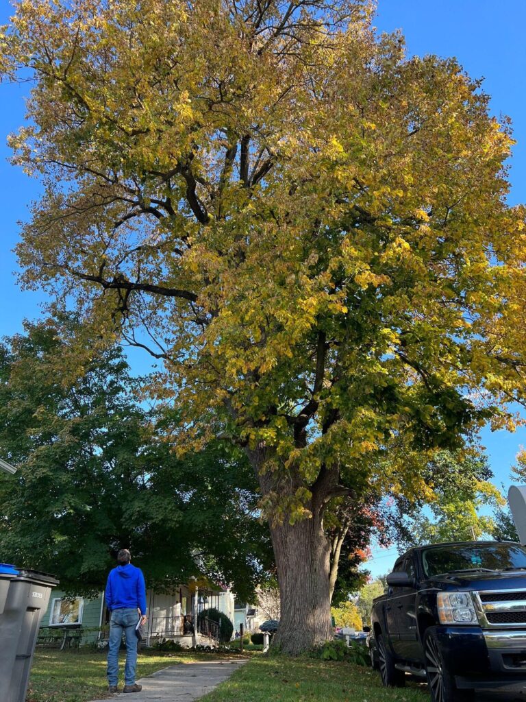 Today, I got to spend the morning with Aaron Sawatsky-Kingsley, learning about the process of evaluating trees and getting a little bit of a tour of some of the oldest trees in the city. The first tree that we took a look at was for a resident who called in to note some concerns that they had. This specific tree looked about 70-80 years old to Aaron’s eye. Some of the concerns noted by the resident related to cracks and older sections of the tree. During Aaron’s analysis, he noted that several areas of the tree are dead or dying, but that isn’t out of the ordinary in an older tree such as this one. At the end of the evaluation, Aaron concluded that the tree could use some maintenance but provides significant benefit to the property owner. Maintaining the tree to prevent property damage is wise, but removing the tree would not be the best action. On our way back, we also visited “Big Red,” a massive 200-plus-year-old Red Oak.