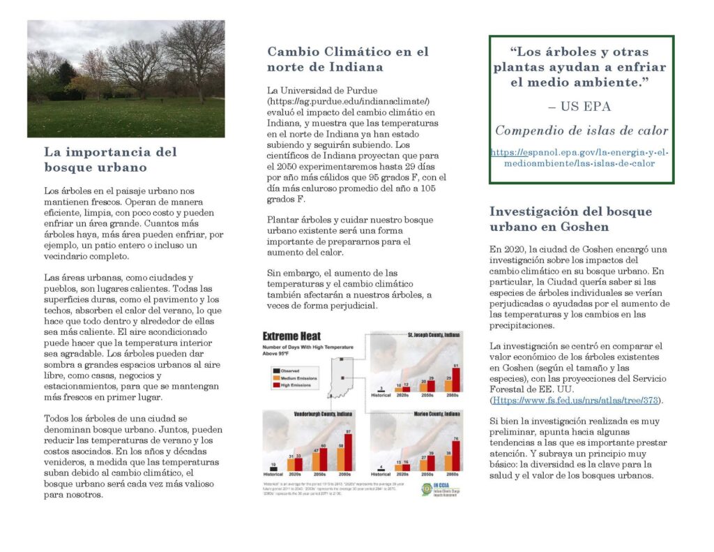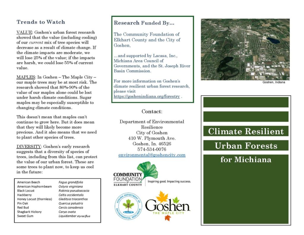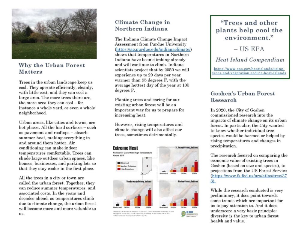 Trees are an important part of the urban human and wildlife ecosystem. As the climate continues to warm, the City of Goshen will be working to protect this valuable infrastructure by understanding the effects climate change has on the local urban forest. Trees that have done well in our area in the past are now beginning to migrate north as the temperatures and precipitation change. With those changes, there will be additional tree species migration from areas south of us to the Goshen area. The following is the beginning of local research designed to assist in making long-term decisions to protect and grow Goshen’s urban forest. The research was done by Aidan Friesen.