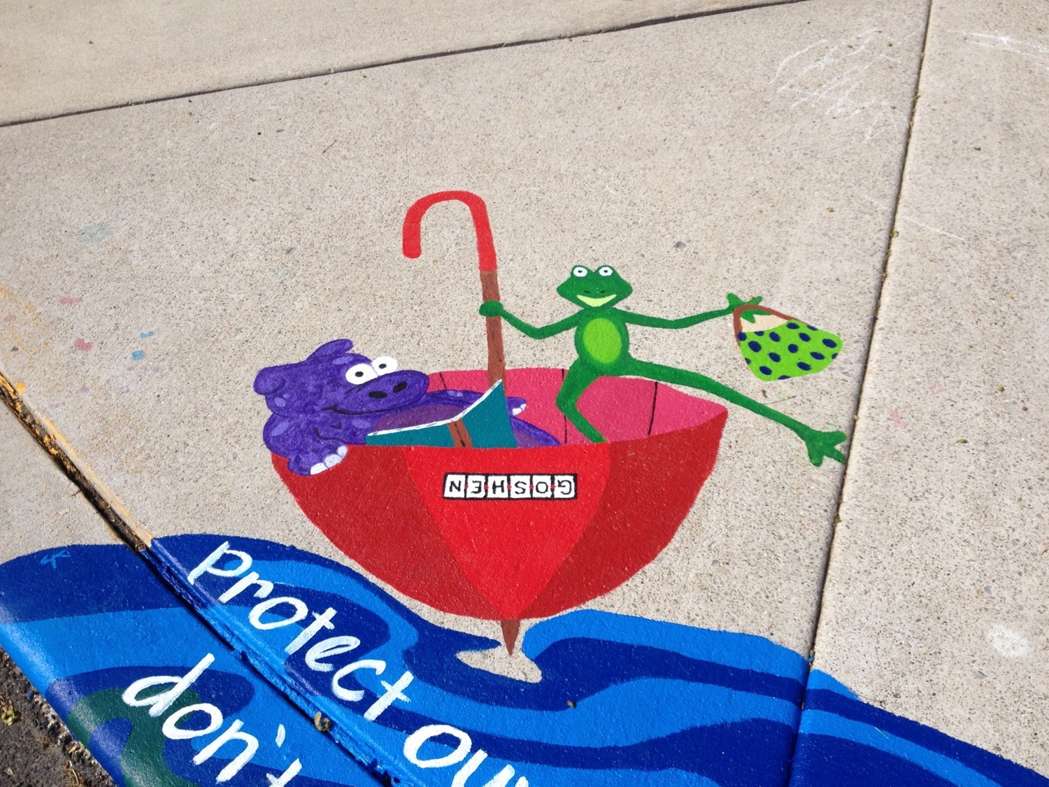 I chose to take a whimsical approach to the theme “A Great Place to Explore.” I decided to put together two unlikely creatures, a hippopotamus and a frog, that need water to survive and have them explore our storm drains and the city of Goshen. I chose these two animals to represent the diversity of animals that are affected by what we put in our storm drains. As they float along the storm drains in an umbrella the frog keeps an eye out for all of the unique places to explore while the hippopotamus reads a book that he picked up from the Goshen Library.