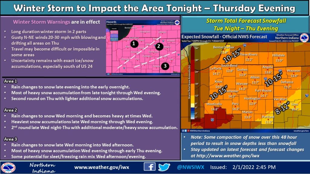 - Thursday February 3, 12 a.m.: Increased winds of 25 mph to 35 mph, with an additional 1 or 2″ snow, drifting, whiteout conditions, and below zero wind chills.