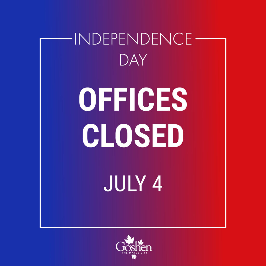 All City of Goshen offices will be closed Monday, July 4, in observance of Independence Day. The Board of works will not have a meeting the week of July 4 due to the holiday.