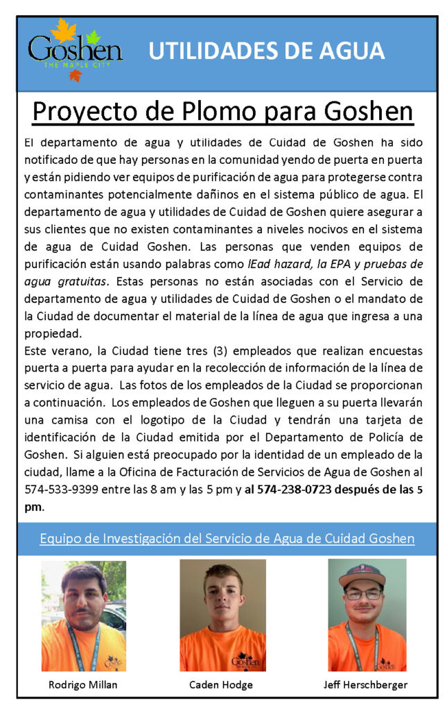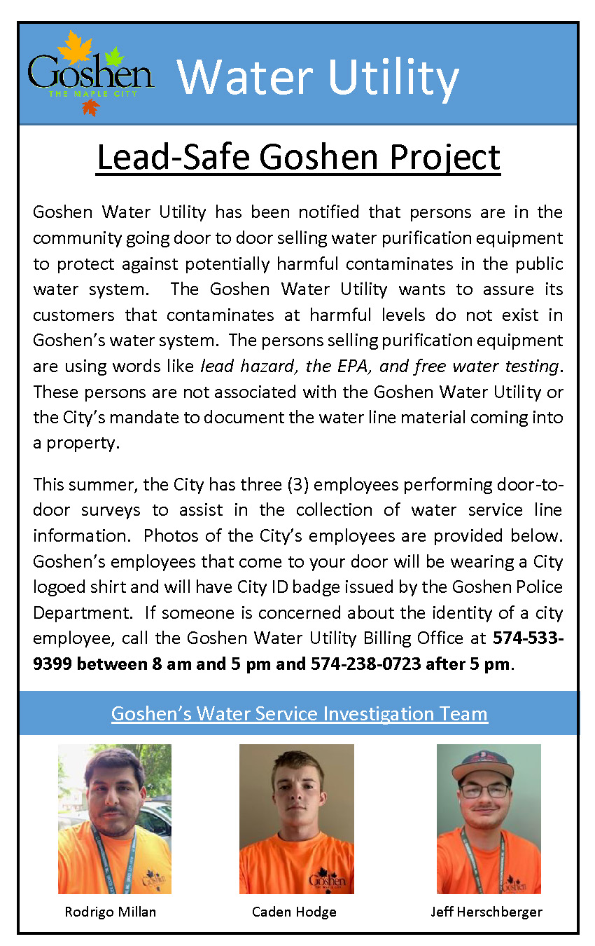 The following information is an important announcement regarding the City of Goshen’s Lead-Safe Program and an explanation of the City employees involved in door-to-door surveys. For more information on this program please visit https://leadsafe-goshenindiana.hub.arcgis.com/.