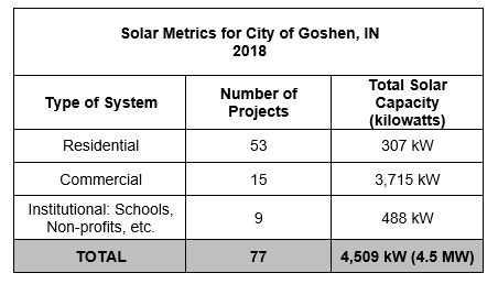 New in 2021: Goshen has partnered with Solar United Neighbors on the Northern Indiana Solar Co-op. For a summary of past initiatives, visit the solarize Northern Indiana website. For more information, visit the MACOG Solar Energy page.