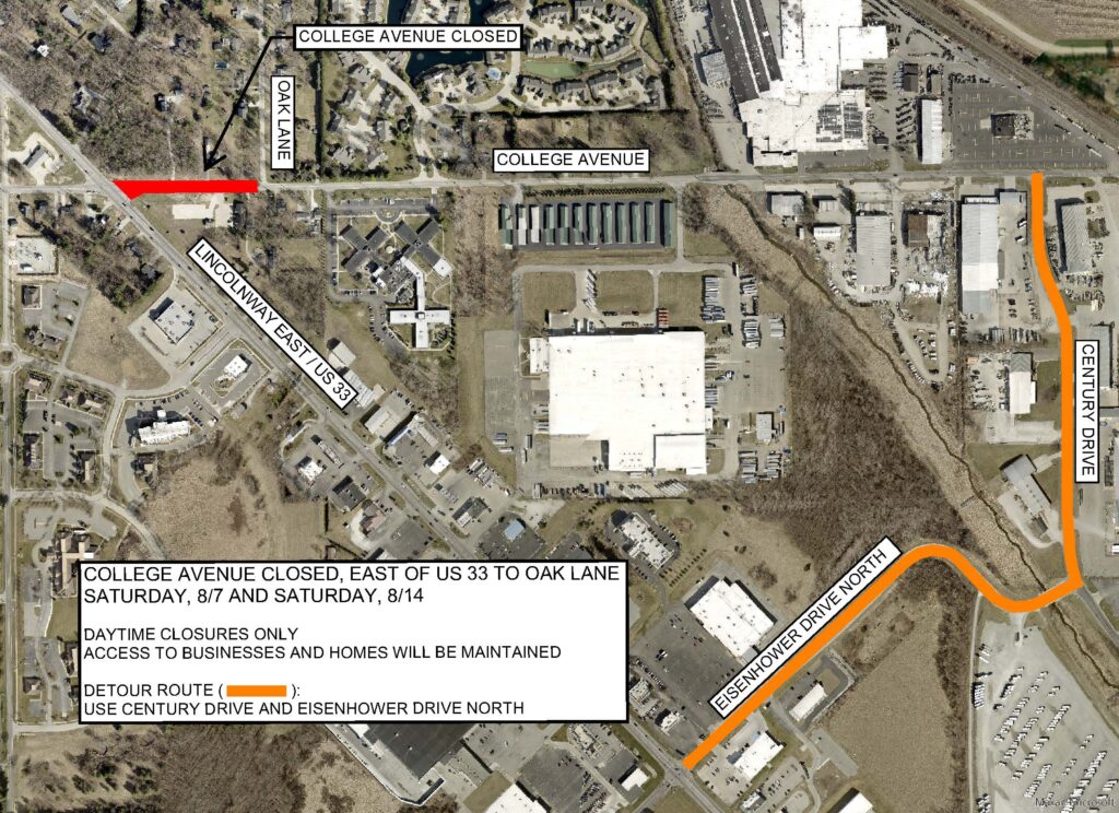 College Avenue, between Lincolnway East/US 33 and Oak Lane will be closed the following two Saturdays for the installation of deep stormwater pipe crossings. This is part of the US33/College Avenue intersection widening project.