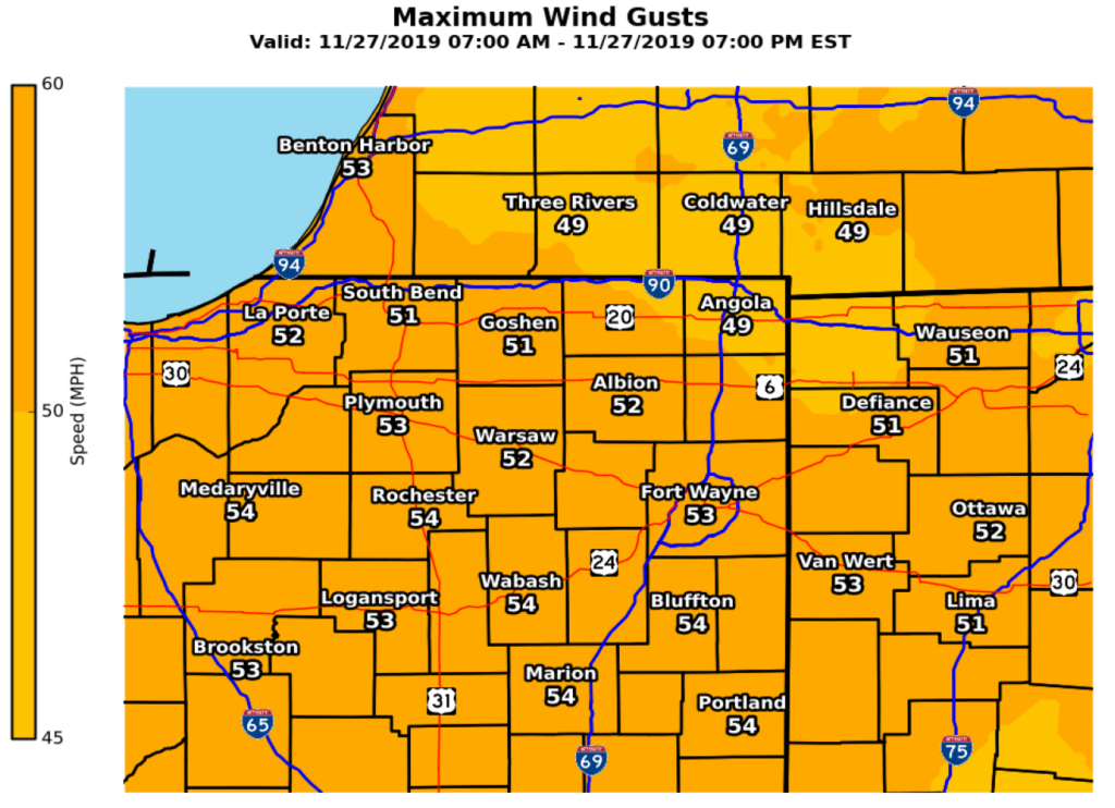 The National Weather Service issued a high wind warning for northern Indiana, including Elkhart County, from 4 a.m. to 9 p.m. Wednesday, Nov. 27.