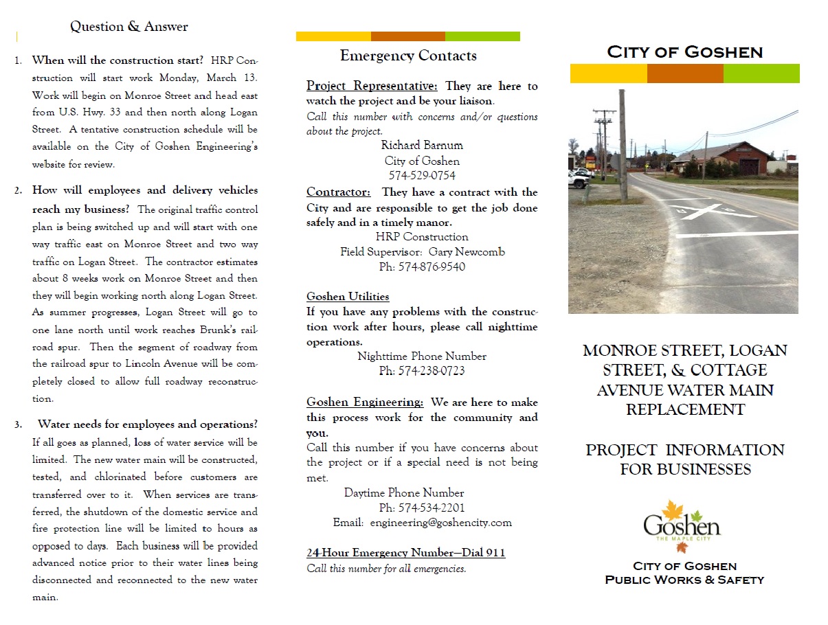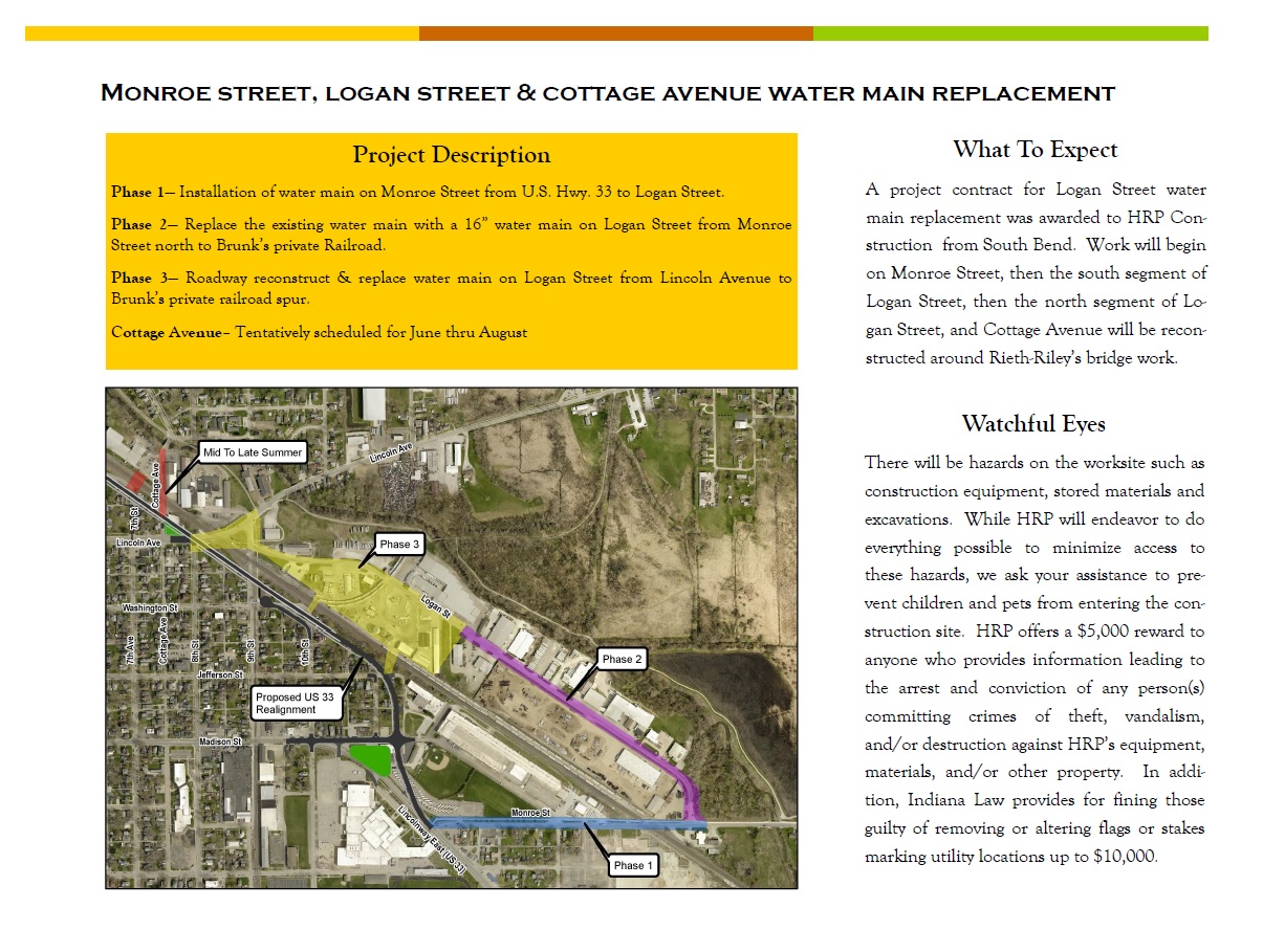 Beginning Tuesday morning, March 14, the westbound lane on Monroe Street will be closed to traffic between U.S. 33 and Logan Street to replace a water main. Traffic will only be allowed to travel eastbound. The contractor estimates work on Monroe Street to last about eight weeks before moving to Logan Street to continue the water main replacement project. Please use caution when driving along Monroe, as there will be construction equipment, stored materials and excavations along the road.