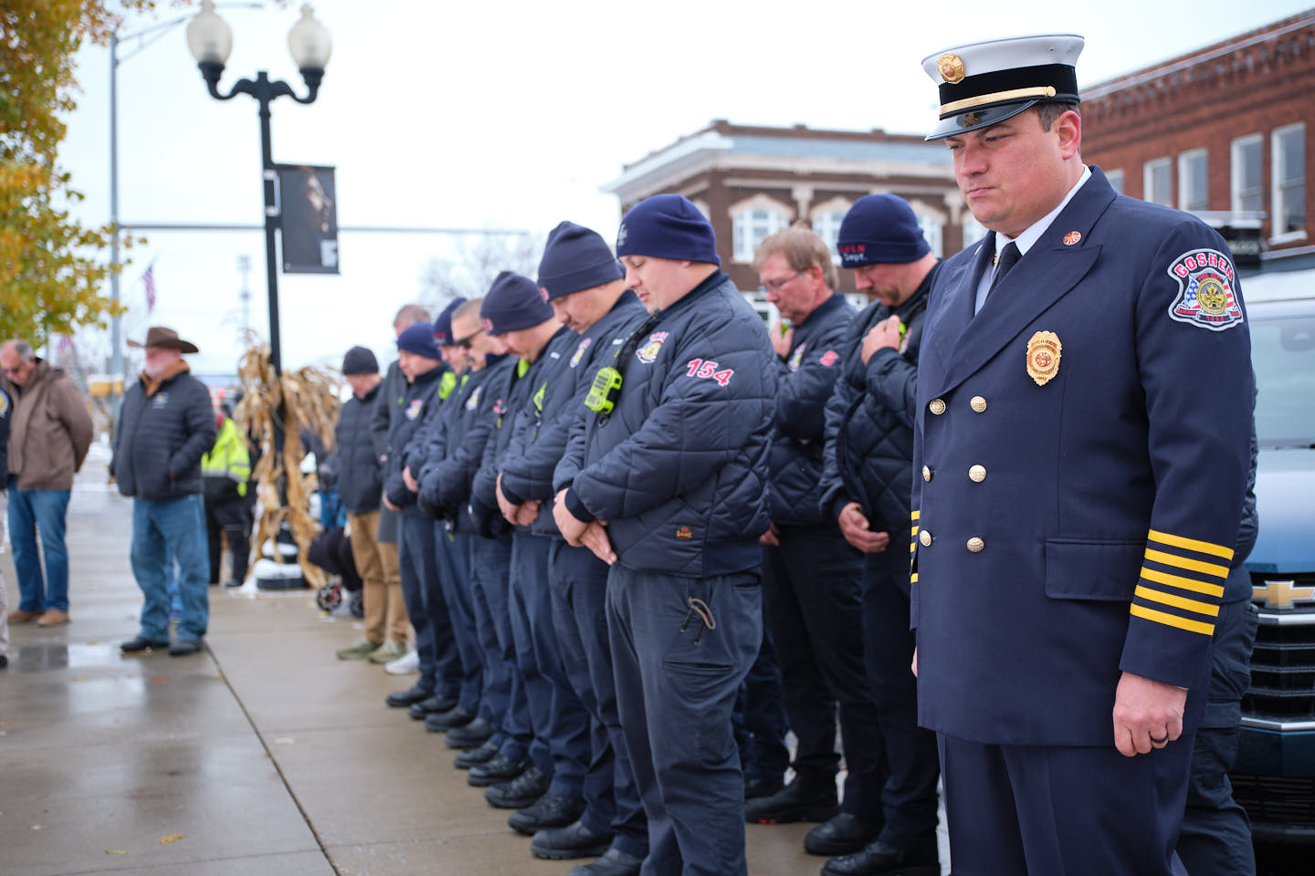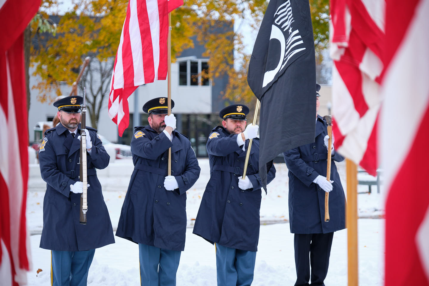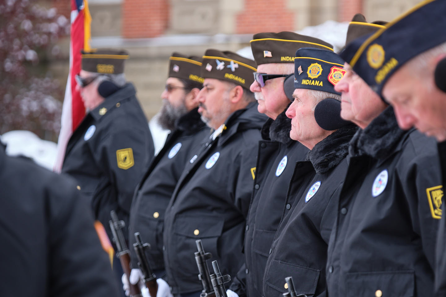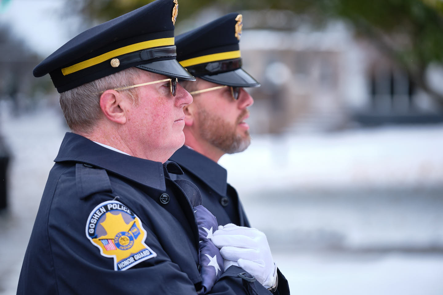 Jeff Gibson and Jamie Helmuth presented the colors. The firing party delivered a three-volley salute. Charlie Stacey performed “Taps.” Mayor Gina Leichty, Police Chief Jose Miller, and Fire Chief Anthony Powell attended. Organizers also recognized Elkhart County Sheriff Jeff Siegel in absentia.