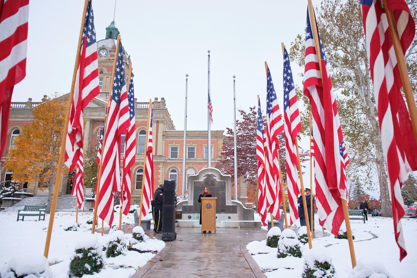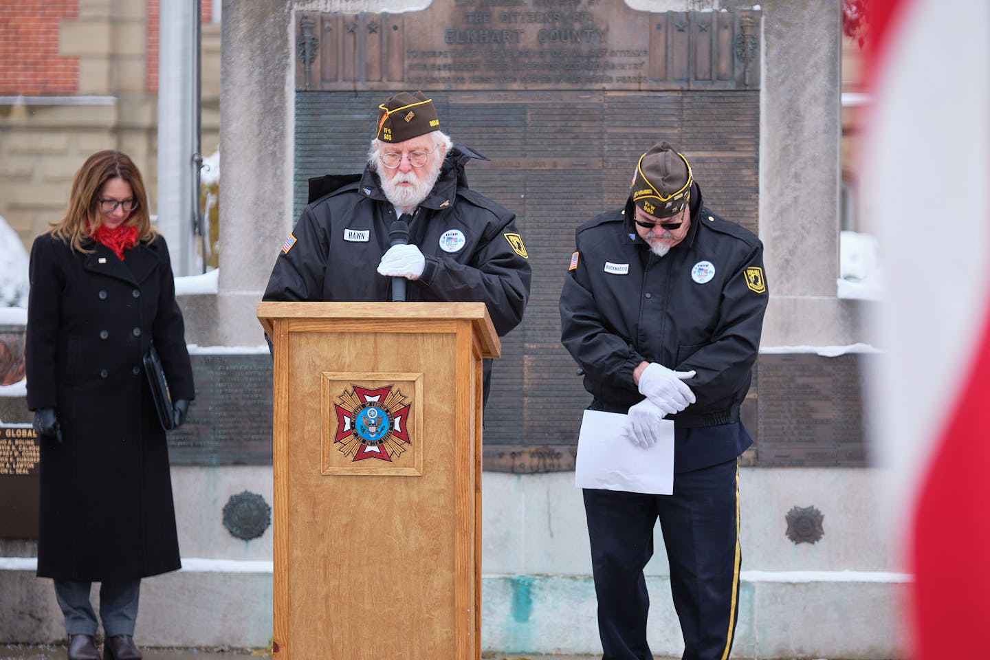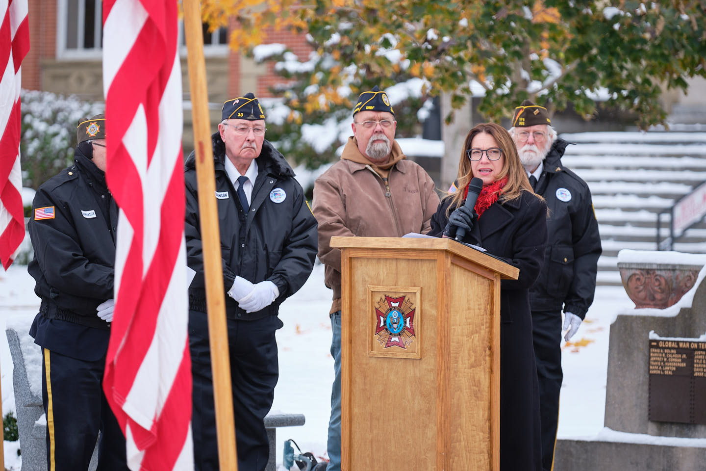 She reflected on the courthouse memorial and the names engraved in bronze. “We are reminded that freedom has never been free,” she said. “Every name represents a life lived with purpose, a promise kept and a legacy that endures to this day in Goshen.”