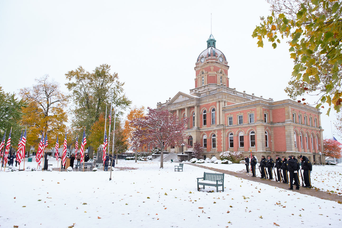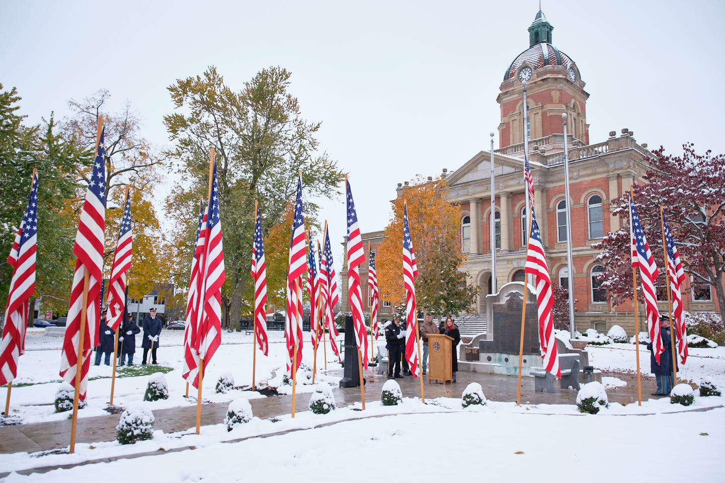 GOSHEN, Ind. — The Veterans Day ceremony in Goshen brought together veterans, families, and community leaders Monday morning at the Historic Elkhart County Courthouse in downtown Goshen. They gathered to honor those who served in defense of the nation.